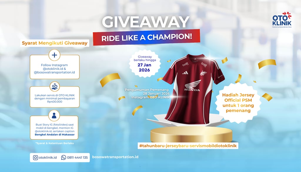 Sebagai bentuk apresiasi kepada pelanggan setia sekaligus dukungan terhadap kebanggaan lokal, Bengkel OTO KLINIK menggelar program giveaway bertajuk “Ride Like A Champion” dengan hadiah Jersey Official PSM untuk 1 orang pemenang.
