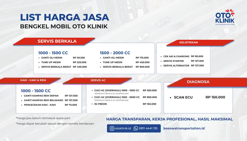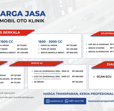 Sebagai bagian dari ekosistem dari Bosowa Transportation, OTO KLINIK menghadirkan standar pelayanan yang mengedepankan kualitas pengerjaan, transparansi biaya, serta kenyamanan pelanggan. Melalui publikasi daftar harga jasa terbaru, pelanggan kini dapat menikmati berbagai layanan servis dengan tarif yang kompetitif dan terbuka.
